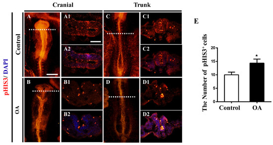 OA exposure promotes cell proliferation in neural tubes. (A,B) Expression of pHI3 in cranial regions of control and OA-treated groups, respectively. (C,D) Expression of pHI3 in trunk regions of control and OA-treated groups, respectively. (A1,B1) and (C1,D1) Transverse sections at the levels indicated by dotted lines from (A,B) and (C,D), respectively. (A2,B2) and (C2,D2) Transverse sections from (A,B1) and (C1,D1) counterstained with DAPI, respectively. (E) A bar chart showing pHIS3+ cell numbers in the transverse sections of control and OA-treated embryos (n = 3, 3 embryos per replicate). Scale bars = 200 μm in (A–D), 100 μm in (A1–D1) and (A2–D2). t-test, * p < 0.05 indicate significant differences between the experimental and control groups.