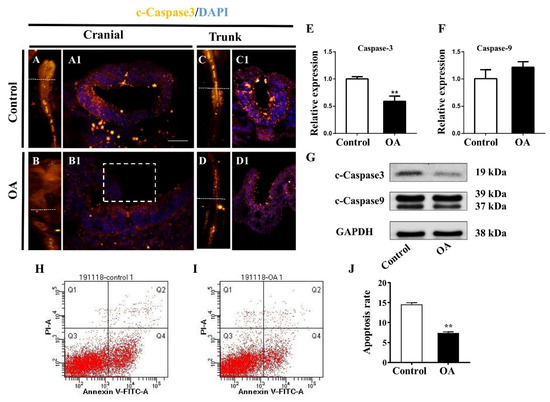 OA exposure inhibits cell apoptosis in neural tubes. (A,B) Expression of c-Caspase3 in cranial regions of control and OA-treated groups, respectively. (C,D) Expression of c-Caspase3 in trunk regions of control and OA-treated groups, respectively. (A1,B1) and (C1,D1) Merge images of transverse sections at the levels indicated by the dotted lines from (A,B) and (C,D), respectively. (E,F) A bar chart showing the transcriptional expression of c-Caspase3 and c-Caspase9 in control and OA-treated embryos (n = 3, 15 embryos per replicate). (G) Western blotting data showing the protein expressions of c-Caspase3 and c-Caspase9 in control and OA-treated embryos (n = 3, 16 embryos per replicate). (H,I) Flow cytometry ‘dot’ plots following staining with propidium iodide and annexin V–FITC of embryo cells in control (H) and OA-treated (I) groups (n = 3, 15 embryos per replicate). (J) The bar chart showing the apoptosis rate based on the flow cytometry analysis (n = 3, 15 embryos per replicate). Scale bars =200 μm in (A–D), 100 μm in (A1–D1). t-test, * p < 0.05 and ** p < 0.01 indicate significant differences between the experimental and control groups.