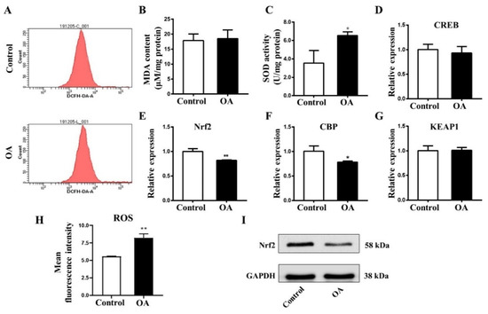 To understand whether oxidative stress is promoted in early chick embryos after OA exposure, flow cytometry was employed to detect ROS content in chick embryos. As in Figure 6, ROS content (Figure 6A,H) and SOD activity (Figure 6B) were evidently increased after OA treatment. However, there were no significant changes in malondialdehyde (MDA) level (Figure 6C). qPCR data demonstrated that Nrf2 and CBP transcripts were markedly down-regulated, while CREB and KEAP1 mRNA levels did not experience any changes (Figure 6D–G). Western blot analyses revealed that Nrf2 expression was distinctly reduced in protein level after OA exposure (Figure 6I). These results indicate that OA exposure induced oxidative stress in early chick embryos and inhibited the Nrf2 signaling pathway.