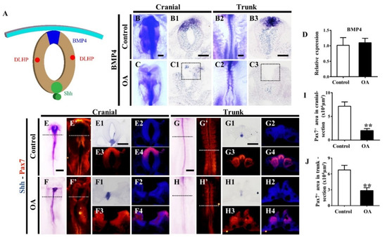 OA exposure represses the expressions of BMP4 and Shh in neural tubes. (A) Schematic diagram shows DLHP, BMP4 and Shh expression patterns in the developing neural tubes. (B–C3) In situ hybridization images of BMP4 in the cranial (B,C) and trunk (B2,C2) regions after exposure to OA; the expression of BMP4 in transverse sections at the cranial level (B1,C1) and trunk level (B3,C3) after OA treatment. (D) qRT-PCR data showing the transcriptional expressions of BMP4 in control and OA-treated embryos (n = 3, 3 embryos per replicate). (E–H4) Co-expression of Shh-Pax7 at the whole-mount embryos and the corresponding transverse sections after OA treatment (n = 3, 3 embryos per replicate). (I,J) Pax7+ area in cranial (I) and trunk section, respectively (n = 3). Scale bars = 200 μm in B–C = B2–C2 = E–G = E’–G’, 100 μm in B1–C1 = B3–C3 = E1–E4 = F1–F4 = G1–G4= H1–H4. t-test, ** p < 0.01 indicate significant differences between the experimental and control groups.