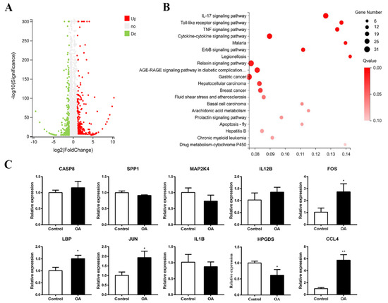 Differential expression gene analyses and qPCR validation. (A) Volcano diagram of differential genes. (B) KEGG pathway enrichment analysis after OA-treatment. (C) qPCR analyses of DEGs on Toll-like receptor signaling pathway after OA exposure (n = 3, 15 embryos per replicate). t-test, * p < 0.05 and ** p < 0.01 indicate significant differences between the experimental and control groups.