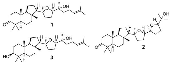 - Achanta, P.S.; Gattu, R.K.; Belvotagi, A.R.V.; Akkinepally, R.R.; Bobbala, R.K.; Achanta, A.R.V.N. New malabaricane triterpenes from the oleoresin of Ailanthus malabarica. Fitoterapia 2015, 100, 166–173. [Google Scholar] [CrossRef]