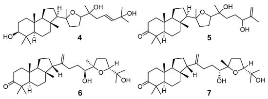 It should be noted that Ailanthus triphysa (Dennst) (syn. A. malabarica) is a deciduous tree common in northern Australia and Thailand, used for a number of therapeutic applications due to anthelmintic, antispasmodic, hypertensive, and other useful properties. It contains metabolites belonging to different chemical classes, including two malabaricane derivatives 4 and 5 (Figure 3). Ailanthusins F (4) and G (5) were evaluated for cytotoxicity against human cancer cell lines, but none of them displayed cytotoxic effects [8].