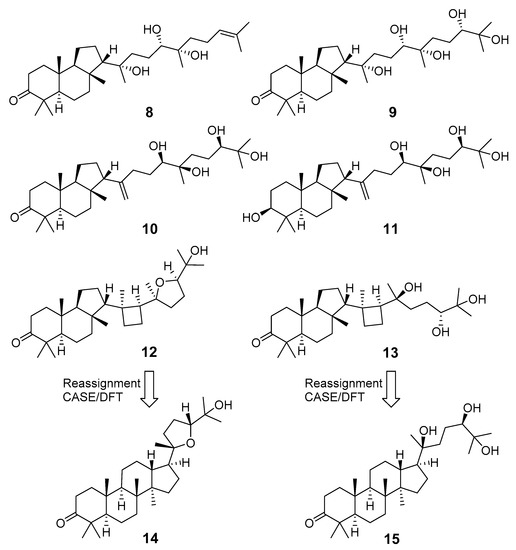 Recent re-investigation of the oleoresin, oozing out of the wounded trunk of A. malabarica, which is used in the manufacture of incense sticks in India, reported six new malabaricane triterpenoids 8–13 with structures established by extensive 1D and 2D NMR spectroscopy along with triterpenoids 1–3 [11]. However, two of these compounds with proposed cyclobutane rings, 12 and 13, have the same 13C NMR data as dammarane triterpenoids ocotillone (14) and gardaubryone C (15), respectively. Their structural reassignment was confirmed using CASE algorithm and DFT chemical shift predictions and led to the revision of their structures [12]. As a result, only four isolated triterpenoids could be considered as malabaricane derivatives (Figure 4). The CASE expert system is based on well-established set of rules connecting the peculiarities of molecular structures with NMR spectra [13,14]. In that study, it was used together with quantum mechanical calculations, founded on density functional theory (DFT). The HMBC, 1H-1H COSY, and HSQC-TOCSY spectra were also applied in order to confirm the revised structures 14 and 15.
