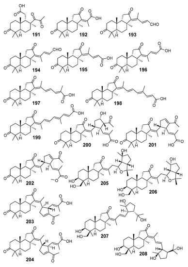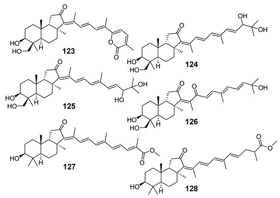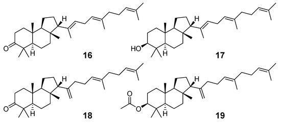 Malabaricatrienone (16) and malabaricatrienol (17) (Figure 5) were found in a methanol extract of the resin from the endemic Bursera microphylla, the so-called “elephant tree”, widespread in the Sonoran Desert in Mexico. Local people usually steep the plant in alcoholic beverages to treat cold sores and abscessed teeth. These malabaricanes were isolated along with known terpenoids, including β-caryophyllene, betulonic acid, and oleanonic acid. The antiproliferative activity of compounds 16 and 17 was evaluated in different murine and human cancer cell lines but they did not show significant effects [15].