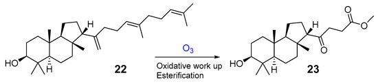 The same triterpenoid ketone 18 along with alcohol 22 were isolated from the commercial gum mastic of the pistachio (mastic tree) Pistacia lentiscus (Anacaridiaceae) grown in the Mediterranean [17] (Figure 6). The gum mastic is used to improve digestion, oral, and liver health and can be chewed as gum or used in powders, tinctures, and capsules. Moreover, mastic essential oil supports the normal condition of the skin. Structure 22 was confirmed by ozonolysis, which gave dioxoester 23 after oxidative treatment followed by esterification [17] (Figure 6).