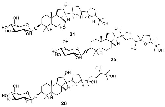 Unlike other triterpenoid glycosides, glycosides of the malabaricane series were rarely found in the studied plants. Such compounds were isolated from Adesmia aconcaguensis, an endemic species from the central Chilean Andes [18]. Three glucopyranosides 24–26 (Figure 7) were studied by NMR and FAB MS methods. Glucopyranosyl moieties were indicated by 1H and 13C NMR spectra as well as by characteristic losses of 162 and 180 mu from the [M + H]+ ions in MS. β-Orientation of the glucosyl residue in 24 followed from chemical shifts of H-1′ (δH 4.95, J = 8.0 Hz) and C-1′ (δC 107.5) in the NMR spectra. Similar chemical shifts were observed in spectra of compounds 25 and 26. Malabaricane-type aglycones differ from other triterpenoids of this series by the presence of a hydroxy group at C-12. Cytotoxic effects of 24–26 against tumor cells were not found.