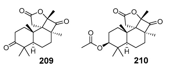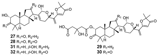 Malabaricane triterpenoids have been tested several times for cytotoxicity against tumor cells, but usually without success; see, for example, [8,15]. However, it was reported very recently that malabaricol (1) itself and its numerous synthetic derivatives obtained by condensation with various aldehydes under alkaline conditions show cytotoxic activity against human lung cancer cell lines, comparable with that of standard doxorubicin [27]. Strong antimalarial [9] and/or antibacterial actions [11] were not found except for sodagnitins A (27) and C (29) from fungi. These malabaricanes proved to be potent inhibitors of bacteria Bacillus subtilis, B. brevis, and Nematospora coryli, and showed strong cytotoxicity against L1210 tumor cells, as well [19].