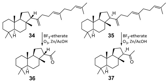 Several triterpenes of malabaricane series were found in some ferns. Lemmaphyllum microphyllum var. obovatum, collected in Okinawa Prefecture (Japan), belongs to the family Polypodiaceae. It was extracted by hexane, and as a result of column chromatography on silica gel followed by separation using 20% AgNO3-Si gel, two new tricyclic hydrocabons 13βH-malabaricatriene (34) and 13aH-malabaricatriene (35) were obtained. The report describes the first case of the malabaricane type hydrocarbons isolation in nature (Figure 9) [20]. The stereochemistry of an asymmetric center at C-13 was determined by the treatment of each compound (34 and 35) with BF3-etherate followed by ozonolysis to obtain the derivatives 36 and 37, respectively. Among them, the first one was gained previously from malabaricol (1) [3,21], while its 13α-epimer 37 was known as a product of colysanoxide (38) ozonolysis [22]. Comparison of the optical rotation data and CD spectra of the ketones made it possible to establish the absolute configurations of asymmetric centers in 36 and 37 as well as those in malabaricanes 34 and 35.