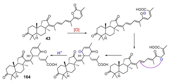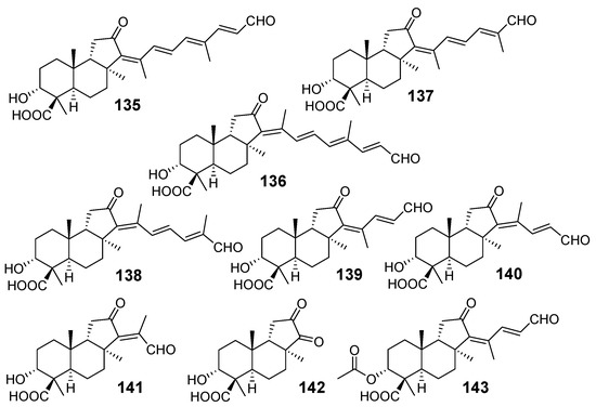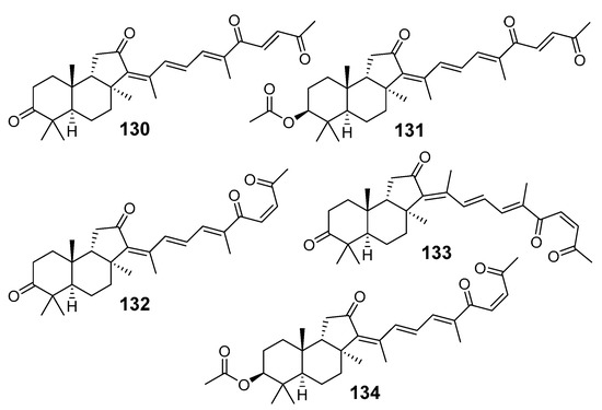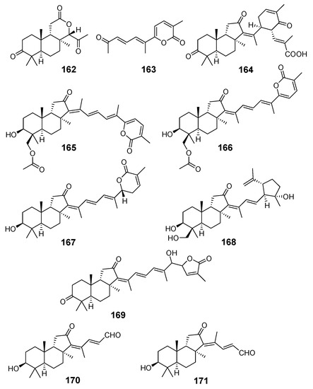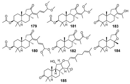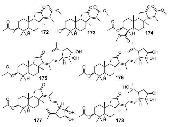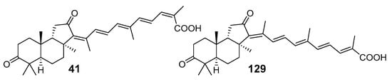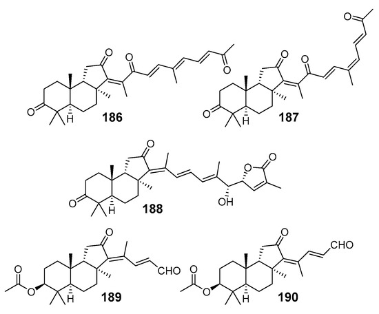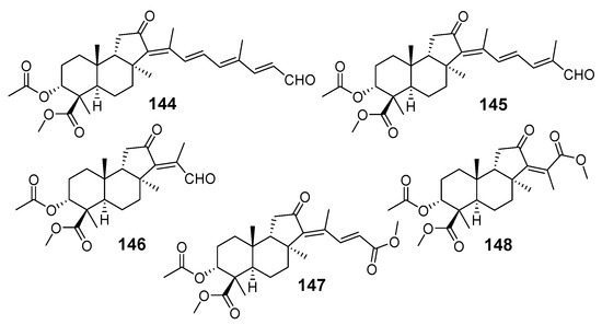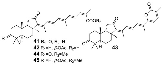 A series of isomalabaricane derivatives, including 43, was named as stellettins (Table 2). Most of them contain terminal δ-lactone ring or carboxyl in a side-chain. Over time, some other related compounds, including nor-triterpenoids and rearranged derivatives, were added to this series.