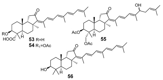 Similarly, four new triterpenoids 53–56 were isolated from a Great Barrier Reef collection of the same sponge and their structures were established by a combination of spectral evidence and chemical degradation [29] (Figure 11). These compounds were also considered to be malabaricane derivatives.