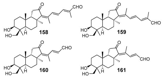 - Zhang, W.H.; Che, C.T. Isomalabaricane-type nortriterpenoids and other constituents of the marine sponge Geodia japonica. J. Nat. Prod. 2001, 64, 1489–1492. [Google Scholar] [CrossRef]