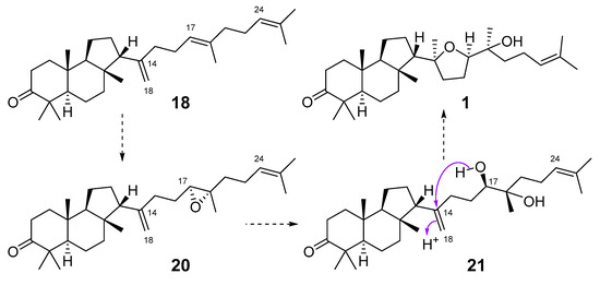 The roots of Pyrethrum santolinoides (syn. Tanacetum sinaicum) (family Asteracea), collected from the Sinai Peninsula in Egypt, were studied by German chemists who isolated two malabaricane triterpenoids (18 and 19), including a ketone 18, which is most likely a precursor of malabaricol (1) (Figure 5). Malabaricol could be a product of epoxidation of ∆17-double bond in 18 led to epoxide 20, followed by hydrolysis and the formation of tetrahydrofuran ring in 1 as a result of the addition of the secondary hydroxy group to C-14 [16] (Scheme 1).