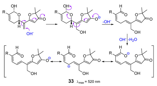 All the reported compounds belong to malabaricane type and contain chromogenic side chains. The color reaction is triggered by addition of a hydroxide anion to the exomethylene group followed by a fragmentation with concomitant opening of the tetrahydropyran ring. The resulting 1,9-dioxononatriene gives rise the highly delocalized red oxonol-anion 33 with λmax = 520 nm (Scheme 2). In support of the proposed scheme, the λmax values reported for similar oxonol-anions are in good agreement with those of alkaline solutions of sodagnitins [19].