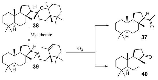 Triterpenoid colysanoxide (38), which contains one additional carbocycle in the side chain, when compared with other malabaricanes, was isolated from the Polypodiaceous ferns of the genus Colysis from Japan [22]. Its structure 38 was established by spectroscopic methods, accompanied with X-ray analysis, and confirmed by chemical transformations. In fact, 38 was treated with 20% BF3-etherate to give unstable diene 39. The latter was ozonized and converted into methylketone 37 along with a small amount of ketone 40. The comparison of ORD and CD spectra of 40 with standard compounds allowed the establishment of the absolute configurations in 39 (Scheme 3).