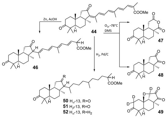 High resolution mass spectrometry established the molecular formula of 44, while UV spectra with strong bonds at λmax = 395 nm and 412 nm showed the presence of a conjugated polyene system. Further NMR analysis and chemical transformations, such as reduction of methyl ester 44 with Zn powder into tetraene 46 and treatment of 44 with ozone followed by dimethylsulfide work up to obtain products 47 and 48, revealed some structure features of 44. In addition, tetradeutero-derivative 49 was obtained to simplify analysis of the 1H NMR spectrum. In its turn, the hydrogenation of 44 with palladium on charcoal in methanol gave products 50 and 51 along with deoxo-derivative 52. The latter was studied by CD spectroscopy.