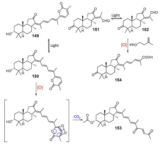 During the study on bioactive triterpenoids from the Fijian marine sponge R. globostellata which stabilize the binding of DNA polymerase to DNA, new variants of stellettins, namely J (64) and K (65), were found [35]. As it was mentioned, some isomalabaricanes can be easily transformed into mixtures of both isomers due to photoisomerization. The report above describes an investigation carried out using defense against sunlight. However, in most cases, such a technique was not used.
