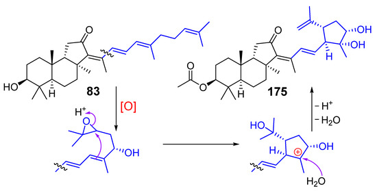 The structural diversity of malabaricanes is limited. Most of them do not contain oxygen atoms additional to 3-hydroxy- or 3-oxo-function; others are oxidized in the side chain. Only a few triterpene glycosides and three compounds, isolated from the fungus A. aconcaguensis, were oxidized in the core moiety.