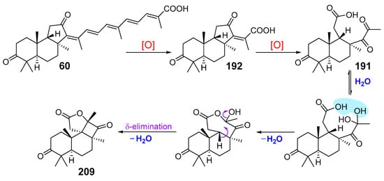 Tetracyclic lanostane and cycloartane derivatives in eukaryotes as well as pentacyclic hopanoids in prokaryotes are the most known classes of polycyclic triterpenoids, which are formed by cyclizations of oxidosqualene and squalene, respectively. Steranes, originated from tetracyclic triterpenoids and hopanes, derived from pentacyclic ones, are frequently found in the sedimentary rocks. These geological records as well as the homology in amino acid sequences of oxidosqualene and squalene cyclases demonstrate that early evolution of triterpenoid cyclases proceeded from common ancestor. Hence, malabaricanoids should be the most ancient polycyclic terpenoids [25].