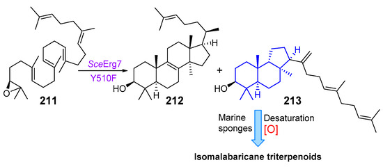 - Lodeiro, S.; Wilson, W.K.; Shan, H.; Matsuda, S.P.T. A putative precursor of isomalabaricane triterpenoids from lanosterol synthase mutants. Org. Lett. 2006, 8, 439–442. [Google Scholar] [CrossRef] [PubMed]