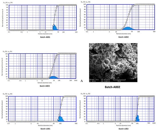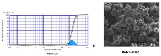 The particle size and size distribution of spray-dried CH acid salts (based on the volume occupied by the particles) are shown in Figure 1. The CH acetate and lactate salts were spray dried at inlet/outlet air temperatures of 160/100 °C in the industrial-scale process (three parallel batches). The spray-dried dry powder of CH salts consisted of spherical agglomerated particles with an average diameter of 36.2 ± 7.0 µm (CH acetate) and 108.6 ± 11.5 µm (CH lactate). After dispersing the spray-dried CH salt powder samples in purified water, a colloidal dispersion was formed by the polymer. The mean particle sizes obtained for the CH acetate salts were 31.4 nm (batch A001), 33.0 nm (A002) and 44.2 nm (A003), and for the CH lactate salts 100.8 nm (batch L001), 103.2 nm (L002) and 121.8 nm (L003). The higher particle size of CH lactate salts could be explained by the higher water activity of CH lactate salts compared to the water activity of CH acetate salts, and because of the increase in the humidification of the sample [34]. As seen in Figure 1, CH acid salts also presented a unimodal particle size distribution, suggesting the homogeneity of the particle size in the colloidal dispersions of each salt. This is a characteristic outcome for the spray-dried pharmaceutical excipients [14]. In addition, the spray-dried CH salt particles exhibited hollow spheres with an exceptionally smooth surface (Figure 1).