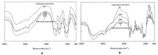 The FT-IR spectra of spray-dried CH acid salts are shown in Figure 2 (industrial-scale CH acetate batches A001, A002, A003 and CH lactate batches L001, L002, L003 and the corresponding laboratory-scale batches).