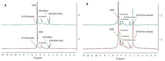 1H-NMR spectra of chitosan (CH) salt powders. (A) The upper (blue) curve represents the 1H-NMR spectrum of spray-dried CH acetate salt obtained in a laboratory-scale process, and the lower (red) curve is the 1H-NMR spectrum of spray-dried CH acetate salt produced in an industrial-scale process (batch A002). (B) The upper (blue) curve represents the 1H-NMR spectrum of spray-dried CH lactate salt obtained in a laboratory-scale process, and the lower (red) curve is the 1H-NMR spectrum of spray-dried CH lactate salt produced in an industrial-scale process (batch L002). The CH salts were spray dried at an inlet/outlet air temperature of 160/100 °C in a laboratory and industrial-scale process.