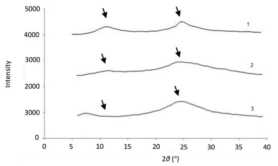 The FT-IR spectra of the samples were collected with an FT-IR spectrometer (Vertex 70/Bruker, Ettlingen, Germany). The IR specimens were mounted as KBr discs. A total of 64 cumulative scans were taken in transmission mode with a resolution of 4 cm−1 and in the frequency range of 4000 to 400 cm−1.