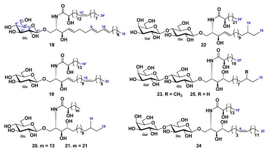 Glucosylcerebrosides, luidiacerebrosides A (20) and B (21), were isolated from the cerebroside fraction obtained from the extract of the starfish Luidia maculata using HPLC [41]. The structures of cerebrosides were determined as 1-O-β-d-glucopyranoside of (2S,3S,4R)-2-[(2R)-2-hydroxyhexadecanoylamino]-16-methyl-octadecane-1,3,4-triol (20) and (2S,3S,4R)-2-[(2R)-2-hydroxytetracosanoylamino]-16-methyl-octadecane-1,3,4-triol (21), respectively [41]. In continuation of the studies on sphingolipids from the same starfish four cerebrosides, luidialactosides A–D (22–25), were isolated from its the water-insoluble lipid fraction [42]. They were proved to contain lactosyl carbohydrate chains attached to C-1 of 2-[(2R)-2-hydroxytetracosanoylamino]-16-methyl-4-octadecene-1,3-diol (22), 2-[(2R)-2-hydroxydocosanoylamino]-14-methyl-1,3,4-hexadecanetriol (23), 2-[(2R)-2-hydroxyhexadecanoylamino]-9-docosene-1,3,4-triol (24), and 2-[(2R)-2-hydroxydocosanoylamino]-1,3,4-hexadecanetriol (25) (Figure 3).