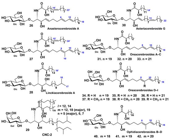 Eight glucosylceramides were found in the Patagonian starfish Anasterias minuta [43]. One of these constituents, anasterocerebroside A (26), was identified as a new glucosylceramide, while the earlier known glucosylceramide (27) was isolated and characterized for the first time as a pure compound. It was earlier isolated in a mixture with related glucosylceramides from the Patagonian starfish Cosmasterias lurida [40]. The structures of these sphingolipids were established by different spectroscopic and chemical methods as (2S,3R,4E,8E,10E)-1-O-(β-d-glucopyranosyl)-2-[(2R)-2-hydroxy-14-tricosenoylamino]-4,8,10-octadecatrien-3-ol (26) and (2S,3R,4E,8E,10E)-1-O-(β-d-glucopyranosyl)-2-[(2R)-2-hydroxy-15-tetracosenoylamino]-9-methyl-4,8,10-octadecatrien-3-ol (27) (Figure 4).