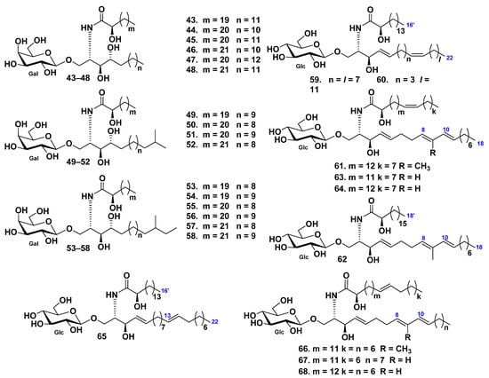In total, 21 galactocerebrosides, including 16 new compounds (43–58) (Figure 5), were identified as cerebroside molecular species obtained from the chloroform–methanol extract of pyloric caeca cut out from the starfish Protoreaster nodosus [49]. These compounds were phytosphingosine-type galactocerebrosides with hydroxylated fatty acyl moieties. It is important, that GC–MS analysis, followed by methanolysis and periodate oxidation of these metabolites, gave reliable structural information of ceramide moiety rapidly in minute amounts. The structures of earlier known compounds were the same as those of galactosylcerebrosides previously found from other starfish and even mammalians.