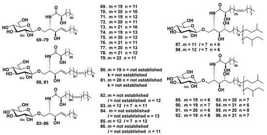 Moreover, 10 glucocerebrosides, HPC-3-A–HPC-3-J (87–96), were isolated from the extract of the sea cucumber Holothuria pervicax [53]. All these compounds were mixtures of regio-isomers for terminal methyl groups in the LCB moiety, namely, mixtures of iso- and anteiso-isomers (Figure 6).