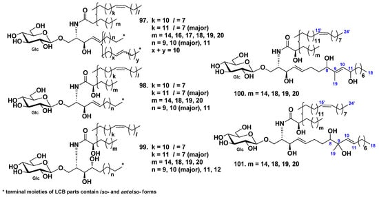 Five glucocerebroside molecular species (SJC-1-SJC-5, 97–101) were isolated from the extract of the sea cucumber Stichopus japonicus [54]. Cerebrosides 97–99 were sphingosine- and phytosphingosine-type derivatives with nonhydroxylated and hydroxylated fatty acyl moieties. At the same time, cerebroside molecular species 100 and 101 were also sphingosine-type glucocerebroside molecular species with hydroxylated fatty acid moieties, although they were new compounds with unique sphingosine bases containing additional two hydroxy groups (Figure 7).