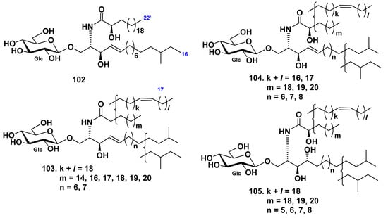An anteiso-type regio-isomer on the LCB moiety HLC-2-A (102) from the extract of the sea cucumber Holothuria leucospilota were isolated from its glucocerebroside molecular species HLC-2 (104), composed of iso- and anteiso-isomers [56]. Other glucocerebroside molecular species HLC-1(103) and HLC-3 (105) were indicated together with HLC-2 (Figure 8).