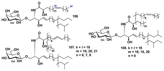 The galactocerebroside BAC-4-4a (106) was isolated from its parent galactocerebroside molecular species BAC-4 (107), which was obtained from the extract of the sea cucumber Bohadschia argus [58]. BAC-4 was obtained together with earlier known glucocerebroside molecular species [53,54,56]. The structure of 106 was determined as (2S,3R,4E)-1-O-(β-d-galactopyranosyl)-2[(2R,15Z)-2-hydroxytetracosenoylamino]-4-heptadecene-1,3-diol (Figure 9). Before this study, galactocerebrosides were not found in sea cucumbers.