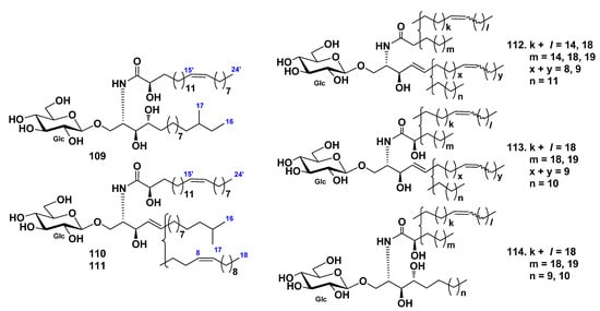 Three glucocerebrosides, CF-3-1, CF-3-2, and CF-3-3 (109–111), were isolated from the cerebroside fraction, which was obtained from the chloroform–methanol extract of the sea cucumber Cucumaria frondosa by La et al. [63]. The structures of these cerebrosides were determined as 1-O-β-d-glucopyranosides of (2S,3S,4R)-2-[(2R,15Z)-2-hydroxy-15-tetracosenoylamino]-14-methylhexadecane-1,3,4-triol (109), (2S,3R,4E)-2-[(2R,15Z)-2-hydroxy-15-tetracosenoylamino]-15-methyl-4-hexadecene-1,3-diol (110), and (111) (2S,3R,4E,8Z)-2-[(2R,15Z)-2-hydroxy-15-tetracosenoylamino]-4,8-octadecadiene-1,3-diol (Figure 10). Compounds 110 and 111 were obtained as pure compounds for the first time.
