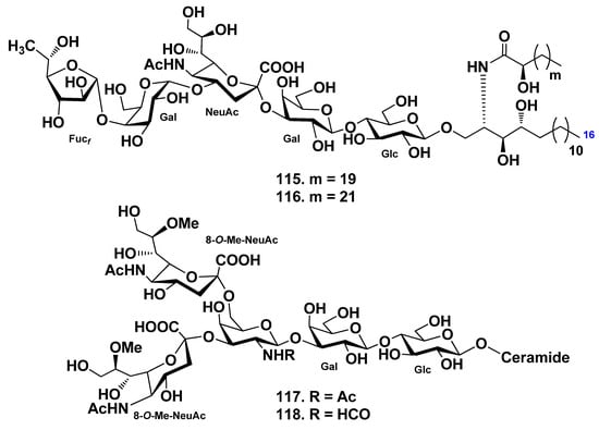 Gangliosides molecular species were isolated from the starfish Evasterias echinosoma, and their structures were elucidated [66]. Two major sphingolipids (117, 118) were found to be disialogangliosides, whose carbohydrate chain is based on the trisaccharide β-N-acylgalactopyranosaminyl-(1→3)-β-galactopyranosyl-(1→4)-β-glucopyranose (acyl is formyl or acetyl). Both residues of 8-O-methyl-N-acetylneuraminic acid are attached to the N-acylgalactosamine residue at positions C-3 and C-6. Compound 118 is the first example of when an N-formyl derivative of an amino sugar was found in gangliosides. The lipid part of the gangliosides molecular species consists of monounsaturated sphingoid base and nonhydroxylated fatty acids (mainly, palmitic and stearic acids) (Figure 11).
