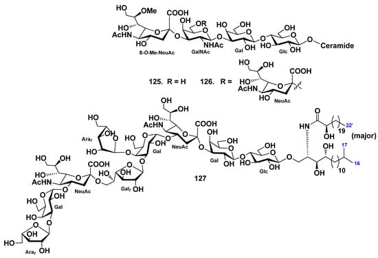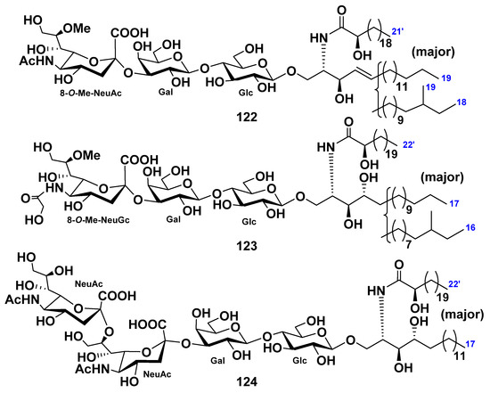 Two monomethylated GM3-type ganglioside molecular species (122 and 123) were isolated from the extract of the starfish Luidia maculata [68]. The structures of these gangliosides were determined as 1-O-[8-O-methyl-(N-acetyl-α-d-neuraminosyl)-(2→3)-β-d-galactopyranosyl-(1→4)-β-d-glucopyranosyl]-ceramide (122) and 1-O-[8-O-methyl-(N-glycolyl-α-d-neuraminosyl)-(2→3)-β-d-galactopyranosyl-(1→4)-β-d-glucopyranosyl]-ceramide (123). The ceramide moieties were composed of heterogeneous nonhydroxylated fatty acid, 2-hydroxy fatty acid, sphingosine, and phytosphingosine units. Compound 122, designated as LMG-3, represented new ganglioside molecular species. Compound 123 was identified as a known ganglioside molecular species (Figure 13).