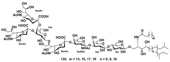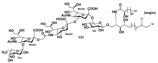 The ganglioside molecular species HPG-7 (131) was isolated from the chloroform–methanol extract of the sea cucumber Holothuria pervicax [79]. On the basis of the spectroscopic and chemical evidence, the structure of the major component of 131 was determined as 1-O-[α-l-fucopyranosyl-(1→4)-(N-acetyl-α-d-neuraminosyl)-(2→11)-(N-glycolyl-α-d-neuraminosyl)-(2→4)-(N-acetyl-α-d-neuraminosyl)-(2→6)-β-d-glucopyranosyl]-(2S,3S,4R)-[(2R)-2-hydroxytetracosanoylamino]-14-methyl-hexadecane-1,3,4-triol (Figure 16). The trisialo-ganglioside was isolated for the first time from sea cucumbers. HPG-7 (131) was studied for neuritogenic action toward the PC12 rat pheochromocytoma cell line. It was shown that 131 does not have neuritogenic activity, in comparison with control, at a concentration of above 10 μg/mL, similar to three other ganglioside molecular species (HPG-1, HPG-3, and HPG-8) [80].