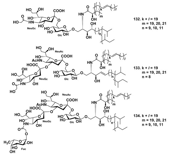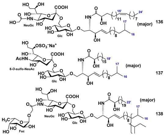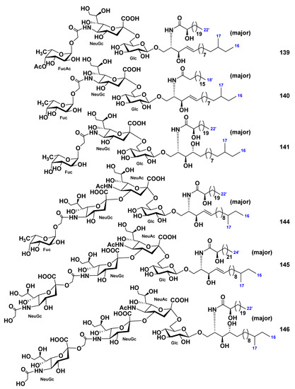 In addition, the hematoside-type ganglioside LLG-1 (121) was obtained from the polar lipid fraction of the starfish Linckia laevigata [77]. The structure of LLG was elucidated on the basis of spectroscopic and chemical evidence as 1-O-[(N-glycolyl-α-d-neuraminosyl)-(2→3)-β-d-galactopyranosyl-(1→4)-β-d-glucopyranosyl]-ceramide. The ceramide moiety was composed of 2-hydroxy fatty acids and phytosphingosine units (normal- and iso-type long-chain bases). This was the first report on the isolation and structure elucidation of naked hematoside-type ganglioside from echinoderms (Figure 12).