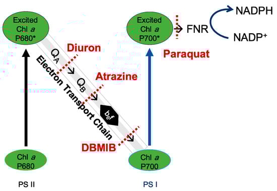 - Fuerst, E.P.; Norman, M.A. Interactions of herbicides with photosynthetic electron transport. Weed Sci. 1991, 39, 458–464. [Google Scholar] [CrossRef]