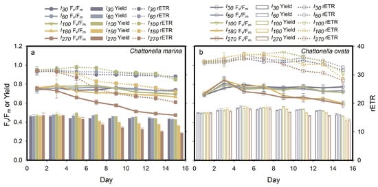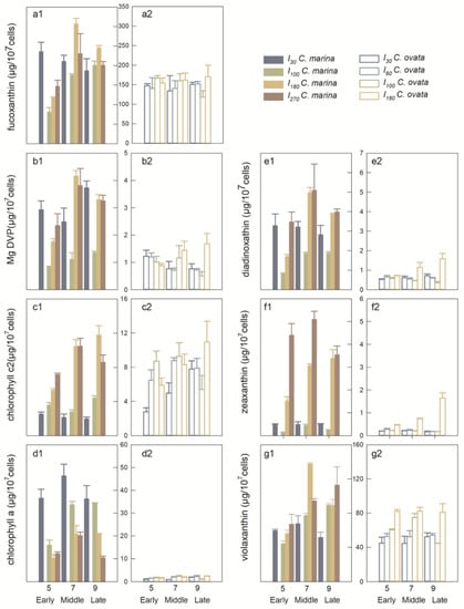 - Hennige, S.J.; Coyne, K.J.; MacIntyre, H.; Liefer, J.; Warner, M.E. The photobiology of Heterosigma akashiwo. Photoacclimation, diurnal periodicity, and its ability to rapidly exploit exposure to high light. J. Phycol. 2013, 49, 349–360. [Google Scholar] [CrossRef]