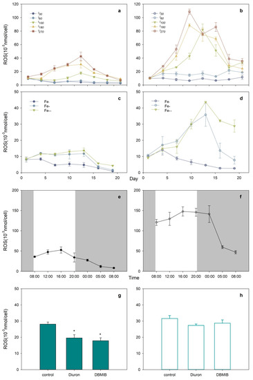 - Portune, K.J.; Craig Cary, S.; Warner, M.E. Antioxidant enzyme response and reactive oxygen species production in marine raphidophytes. J. Phycol. 2010, 46, 1161–1171. [Google Scholar] [CrossRef]