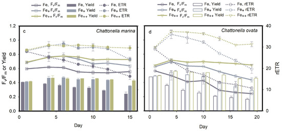- Devadasu, E.R.; Madireddi, S.K.; Nama, S.; Subramanyam, R. Iron deficiency cause changes in photochemistry, thylakoid organization, and accumulation of photosystem II proteins in Chlamydomonas reinhardtii. Photosynth. Res. 2016, 130, 469–478. [Google Scholar] [CrossRef] [PubMed]
