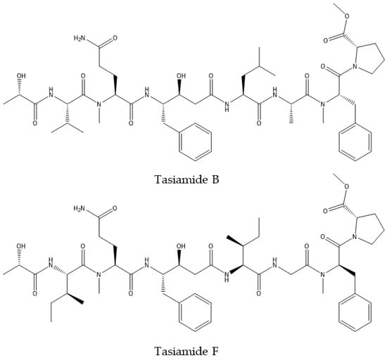 - Al-Awadhi, F.H.; Ratnayake, R.; Paul, V.J.; Luesch, H. Tasiamide F, a potent inhibitor of cathepsins D and .E from a marine cyanobacterium. Bioorg. Med. Chem. 2016, 24, 3276–3282. [Google Scholar] [CrossRef]
