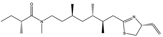 - LePage, K.T.; Goeger, D.; Yokokawa, F.; Asano, T.; Shioiri, T.; Gerwick, W.H.; Murray, T.F. The neurotoxic lipopeptide kalkitoxin interacts with voltage-sensitive sodium channels in cerebellar granule neurons. Toxicol. Lett. 2005, 158, 133–139. [Google Scholar] [CrossRef]