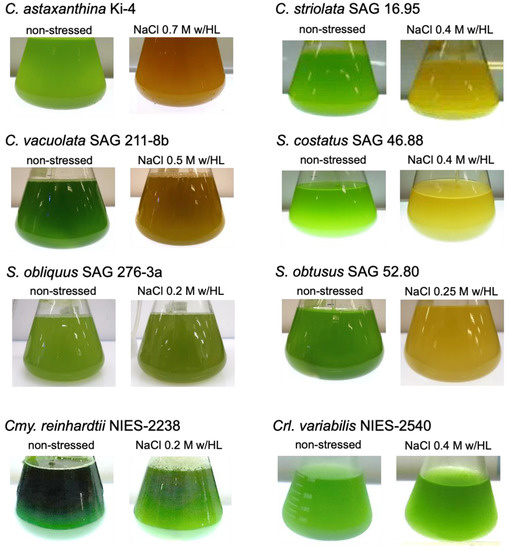 Strains Ki-4 and Oki-4N showed the optimum expression level of AstaP when they were grown under 0.7 M and 0.5 M NaCl stress with high light exposure conditions (800 µmol photons m−2 s−1), respectively, where the color of cells changed from green to orange [9,10]. The tested Scenedesmaceae strains’ cell color turned from green to white under the same stress conditions as Ki-4; therefore, we examined the upper limits of salt concentrations for each strain under the same high light intensity. Figure 1 shows the change in cell color of the strains after one to two weeks from the start of stress treatments using the upper limit of salt concentrations for each strain under high light exposure conditions. S. obtusus and S. obliquus turned green to white under 0.3 M NaCl and 0.25 M NaCl with high light exposure conditions; therefore, these strains were stressed by 0.25 M and 0.2 M NaCl, respectively, under the high light exposure conditions. Other strains were stressed with 0.5 M NaCl (for C. vacuolata) or 0.4 M NaCl (for S. costatus and C. striolata) with high light exposure.