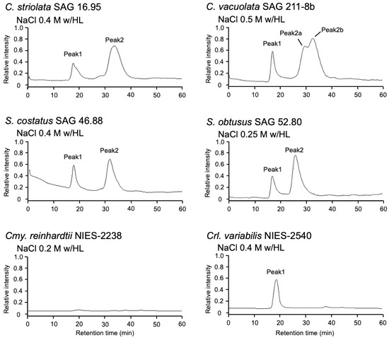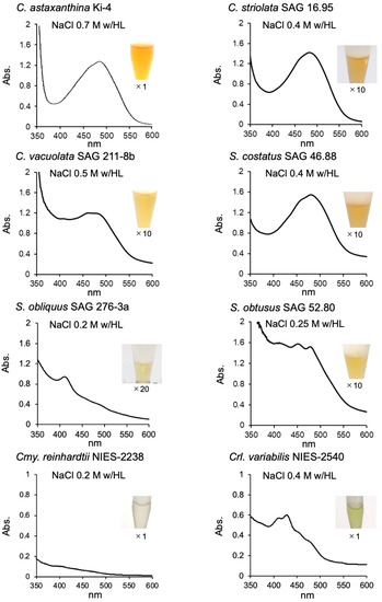 A 1.0 g aliquot of wet cells stressed by salt with a high light exposure was suspended in 9.0 mL of 50 mM Tris-HCl buffer, pH 7.5. Cells were broken by a bead beater instrument, and the aqueous supernatants were obtained after ultracentrifugation. Strain Ki-4 and Oki-4N produced orange supernatants with broad absorption peak at 484 nm (Table 1) [9,10]. Except for S. obliquus, the test strains produced pale orangish or yellowish supernatants. The color of aqueous supernatants from the Scenedesmaceae strains were difficult to detect; therefore, the supernatants were concentrated by using a protein concentrator, and the colors and the absorption spectrum for each strain were shown in Figure 2. The amount of pigment produced per aliquot of cells from each test strain was estimated to be less than 5–10 times lower than that of Ki-4 and Oki-4N (Table 1).