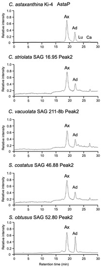 2.5. Identification of AstaP Orthologs in C. vacuolata and Two Model Microalgae