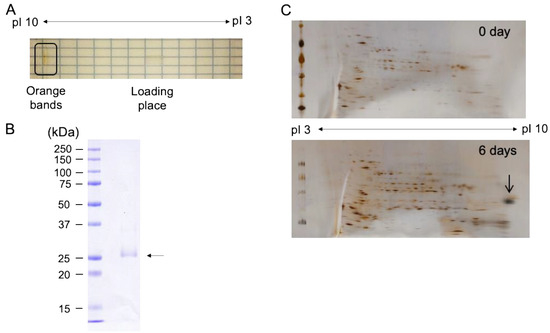 Purification and characterization of AstaP from S. costatus. (A) isoelectric focusing of aqueous pigments. The circle indicates the migrated orange bands after the electrophoresis; (B) the migrated orange band in A excised and electrophoresed by SDS-PAGE. The purified protein is shown by an arrow. Molecular mass standards are shown (kDa); (C) two-dimensional electrophoresis of the total proteins of S. costatus. S. costatus was cultivated under high light conditions and subjected to 0.4 M NaCl for six days. An arrow indicates the excised spot for N-terminal sequencing.